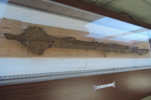 出土した刀。柄の部分がどのような形状か分析の結果を知りたいものだ。