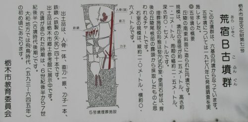 荒宿B古墳群5号墳 円墳 径13.6m、高さ1.5m 皆川城内字荒宿 丘陵 竪穴式石室、直刀、鉄鏃、刀子、人骨 栃木市遺跡詳細分調査報告