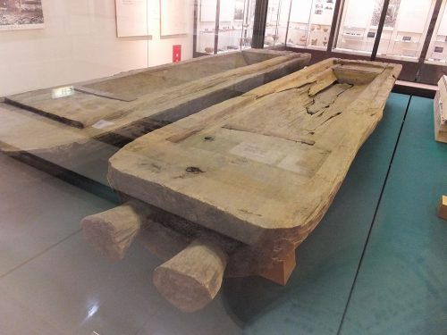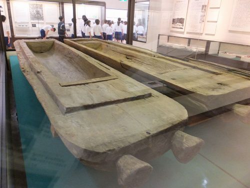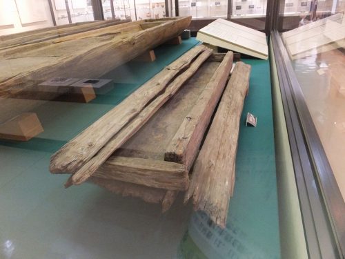 1基はヒノキの舟形木棺で、全長5.49m、幅1.1m。身・蓋ともに両端に2個ずつ縄掛け突起が造り出してある。湧水中にあったためか保存状態は非常に良く、発掘当時は生木に近い部分もありヒノキ特有の芳香があったそうである。