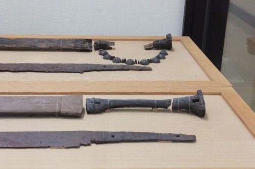 木棺から出土した木装大刀。上は舟形木棺出土の大刀で柄木の三輪玉を伴う。古墳時代のものとして完全な状態で出土したのはこれが初めて。