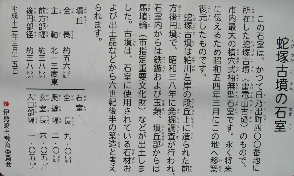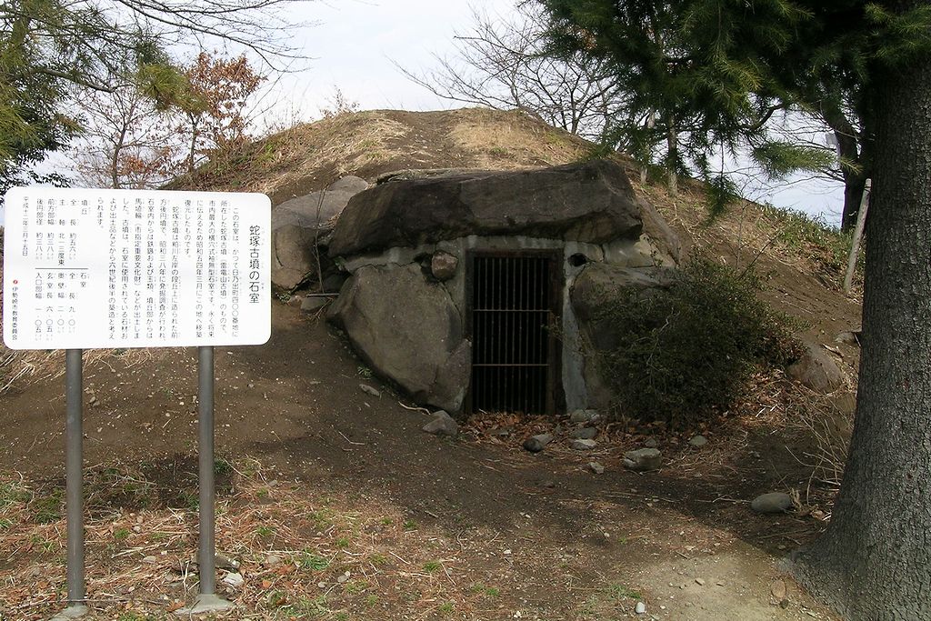 蛇塚古墳(雷電山古墳、殖蓮村299号古墳) 前方後円墳 全長約56m、前方部幅約38m、後円部径約38m 日之出町 形象埴輪(人物、馬、盾、靭)、鉄器類(刀、刀子、鏃、轡、鋏具、吊鎖)、金銅製品(金環、鏡板、杏葉、雲珠)、管玉、小玉 伊勢崎市史、現地案内板