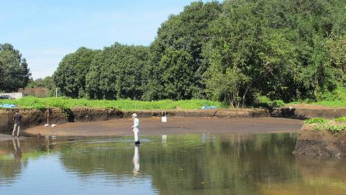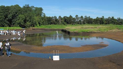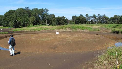16号墳。周溝の巡る円墳。墳丘は削られ主体部は残っていない。この辺りは浅い谷間のようで先週の大雨ので水溜りになっていた。