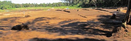右手前が前方部、左が後円部。墳丘がほとんど削られており主体部は発見されなかった。