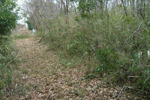 3号墳。公園北側の山林内。道路のあたりが墳丘の裾で右側の藪の中に大きな墳丘が残っている。