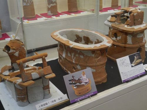 出土した機織形埴輪。古墳時代の機織機は不明な点が多かったが、このほぼ完形の埴輪の発見でその構造が判明した日本初の事例。(2014/04追加)