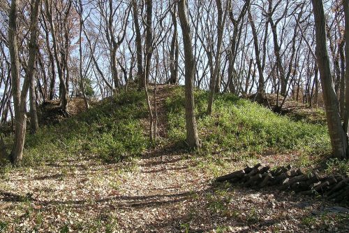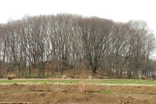 北東から。明治期の発掘で十字型に掘られそのままになっている墳丘。その後の調査で帆立貝形古墳で凝灰岩の切石積横穴式石室をもつことが確認された。