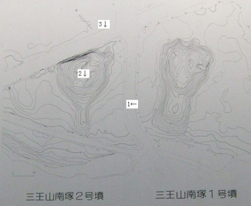 田川の東、南北に伸びる台地上に残る古墳群の南端部、三王山南塚古墳は、道路をはさんで東側を1号墳、西側を2号墳と呼ぶいずれも4世紀代、古墳時代前期に造られた前方後方墳である。1号墳は墳丘全長約46m、後方部幅約26m、前方部幅約20m。2号墳は全長約50m、後方部幅約29m、前方部幅約20mであり、いずれも周溝が巡らされている。特に2号墳は前方部が撥形に広がった極めて珍しい造りで、現在のところ県内で最古の一つに推定されている。埋葬施設は残念ながら破壊を受けており確認できず、副葬品についても不明ではあるが、周溝の調査から壷形土器等が多数出土している。南河内町教育委員会(現地案内板より)