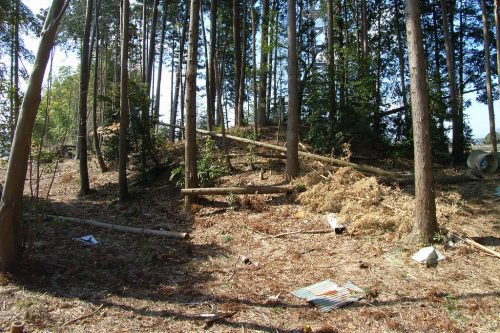 南西から。台地縁辺に築かれた前方後円墳。左奥が後円部、右が前方部。葺石が認められる。