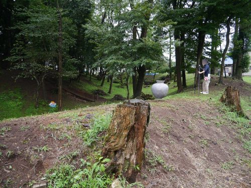 墳頂。段築の平坦面や墳頂平坦面にまで葺き石が葺かれている。(古墳を見上げたとき見える部分のみ葺くことが多いので関東では希少)