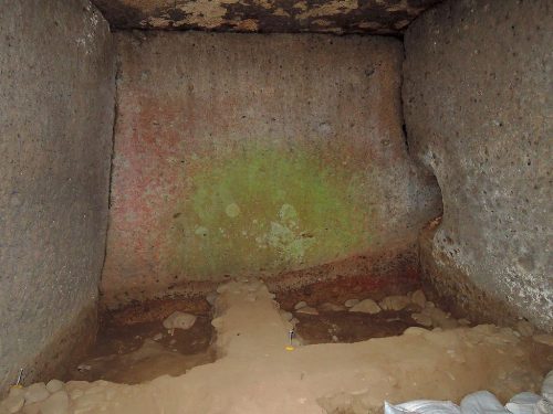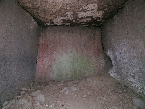 今回の調査で石室全体がベンガラで赤く彩色されていたことが判明。前から奥壁は赤っぽかったが、今回掘り下げた部分に明瞭に朱が残っていた。