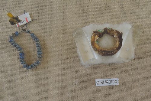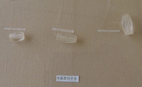 石室の床面から水晶切子玉・ガラス小玉・金銅製耳環など副送品が出土。