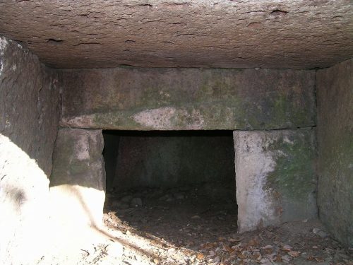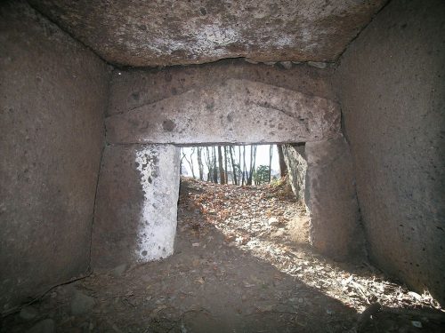 奥から外。(2015年追記。玄室入口の冠石に屋根形の彫りこみがあるがこれは後世のもの。左右の袖石の幅が大きく違うが、これも後世に右側袖石が削られたため。掘り下げたところ袖石下部にその痕跡があった。)