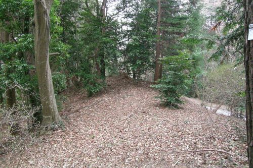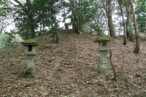 石室開口部。埋没して内部を観察することはできない。明治期の文献によると凝灰岩割石(一部河原石)積の両袖型横穴式石室とのこと。