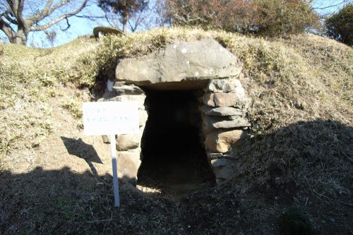 南西から。公民館建設や祠の設置で墳丘が削られているが群中では最も残りがよい。6世紀後半の築造と推定されている。