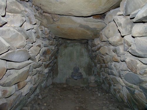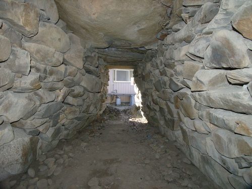 奥から外。側壁の石の隙間は白色粘土で目張りされている。