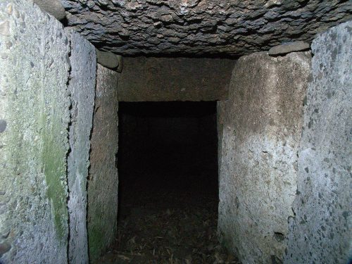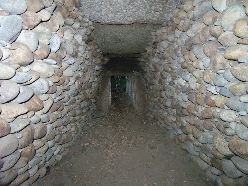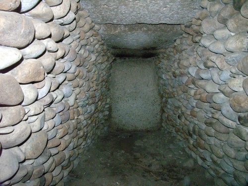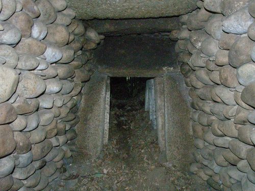 奥から外。側壁は河原石の小口積ですきまは白色粘土で目張りしている。