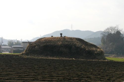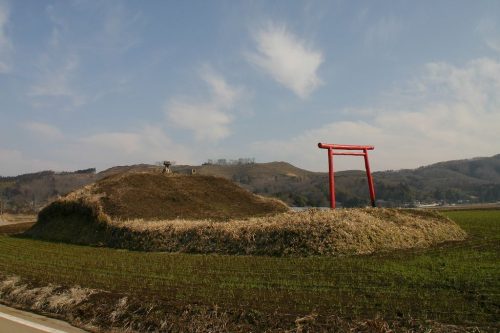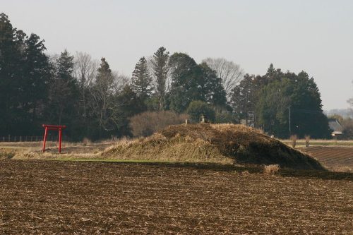 南西から。前方後方墳と見られていたが1976~77年の調査で円墳と判明。南側の低い部分は盗掘で石室を掘り出したときに盛土が南側へ流れ出たためらしい。埴輪片から6世紀後半の築造と推定されている。