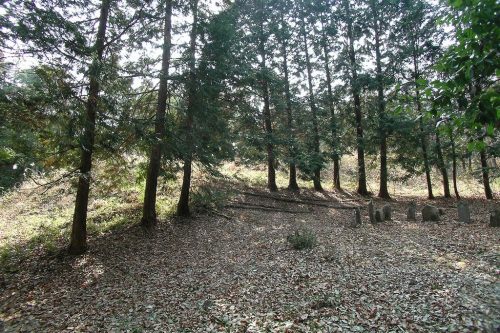 北東から。左が後円部、右奥が前方部。木立の手前が周溝跡。