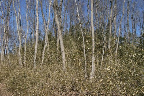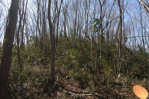 南から。近くまで果樹園があり、古墳のそばを通る尾根道も見通しがよく古墳はすぐに見つかるが、このように藪だらけで観察は困難。径40mの大型円墳で、埴輪・葺石などはみつかっていない。