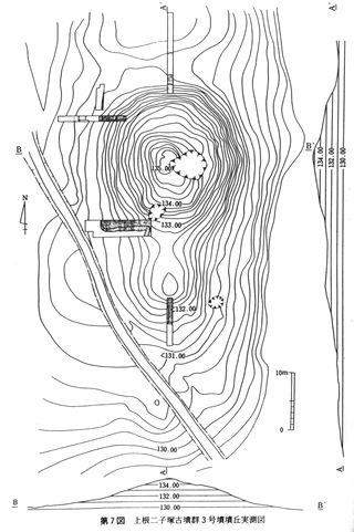 上根二子塚3号墳 前方後方墳 全長約42.7m、後方部幅約24m、同長さ26m、同高3.8m、前方部幅約19.4m、同長さ16.7m、高さ1.6m 上根字二子塚 丘陵 甕形土器 市貝町史、探訪とちぎの古墳