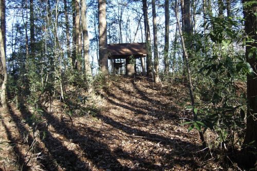 南から。墳頂に祠と寛永年間の碑が残されている。旧状は径12mほどの円墳であったと推定されている。2号墳は消滅。