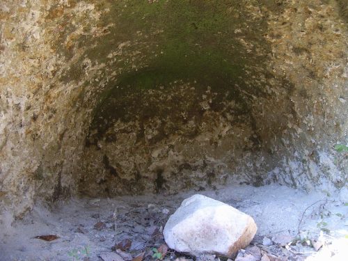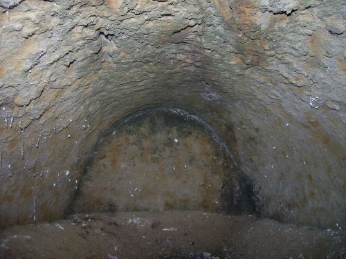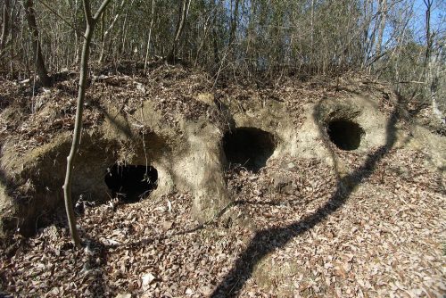 遠景。凝灰岩の崖面を掘削して築かれた横穴墓群。町指定史跡となっており、1~5号墓は見学できる。この南側の崖沿いに多くの横穴墓があるはずだが、そちらは見学できそうもない。7世紀末ころの築造と推定されている。