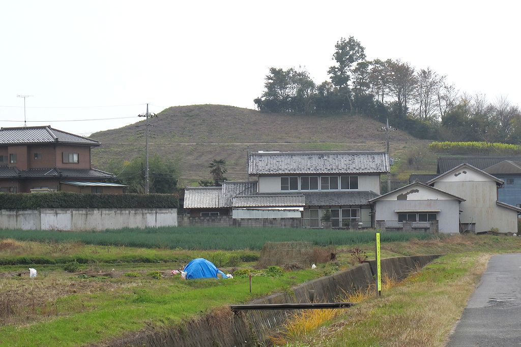 南から。右が後方部、左が前方部で墳丘の状態は良好。初期の前方後方墳で、主体部は粘土槨と思われ、4世紀代の築造と推定されている。市史では、付近に後続する古墳はない、としているが2km西にある2004年に発掘された成塚向山1号墳が同時代のものであることがわかった。