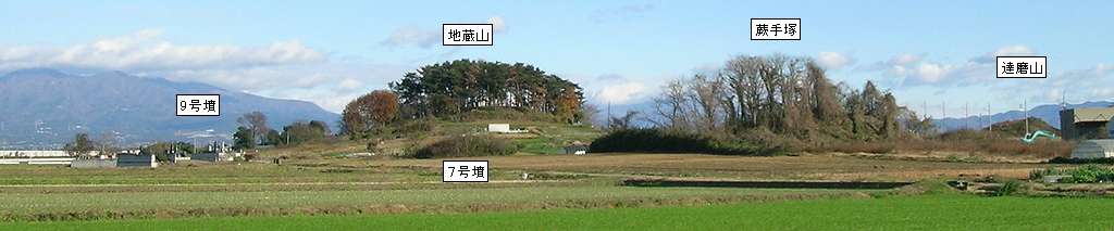 地蔵山古墳群全景。(クリックで拡大)古墳時代中期から終末期にかけて築造されたと推定されている。発掘された多くの古墳が竪穴式または横穴式の埋葬施設をもつ円墳で、土師器や須恵器、形象埴輪が出土し、石室内からは鉄製直刀や刀子、玉類や金銅製耳環などが出土している。また赤堀村16号墳からは小型の白銅製四獣鏡が1枚出土している。