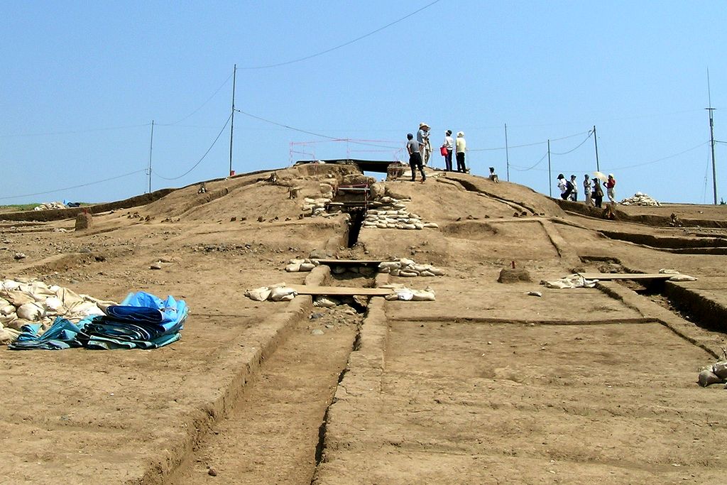 北側の円筒埴輪列。平地を見下ろす2号墳 1号墳のある丘には、たくさんの古墳がある周りの丘とは異なって、その後全く古墳が造られませんでした。そして二百年ほどした6世紀後半、この南側下に2号墳が一つだけ築かれました。長くこの丘は聖なる場所として見られ、2号墳に埋葬された人だけがそのタブーを破ったのかもしれません。 この2号墳は盗掘を受けていましたが、周りには珍しくもハニワを並べた跡がきれいに残っています。 ここからは太田西部の平地が良く見渡せます。特に歴史を伝える多くの古墳が目に入ります。近くには南東の寺山古墳(1号墳と同じ前期)、南側の鶴山・亀山古墳(中期)が目に入り、遠く南西には大きな宝泉茶臼山古墳(中期)も望めます。金山を背景にしたこの美しい景色は、長く千四百年以上もの間、太田市民の先祖たちが親しんだものでした。(第3回現地説明会説明板より)資料 成塚向古墳群現地説明会資料及び現地説明より