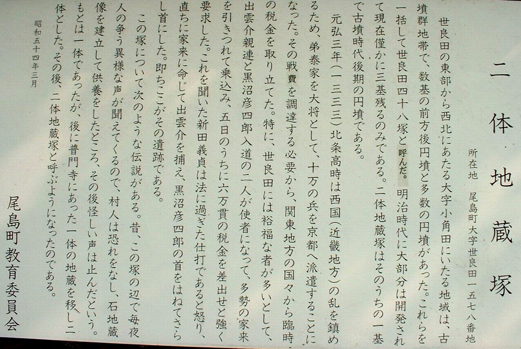 太田市二体地蔵塚古墳(世良田村23号古墳) 90群馬県, お_太田市, 旧お_尾島町, 綜せ_世良田村 コメントを追加 7月 192024 下原古墳群は、世良田公園東方の石田川右岸台地上に分布いています。【アクセス】 ★地図★古墳名 墳形 規模 所在地 立地 出土品、備考 引用二体地蔵塚古墳(世良田村23号古墳) 円墳 径79尺(23.9m)高さ14尺(4.2m) 世良田町 中古新田氏ノ刑場ナリシトイフ 上毛古墳綜覧 南東から。 北東から 墳頂の2体の石地蔵像。 2024年再訪。↓ (撮影 2016/02、2024/05) 返信する 返信をやめる Your Comment 以下のHTML タグと属性が利用できます: <a href="" title=""> <abbr title=""> <acronym title=""> <b> <blockquote cite=""> <cite> <code> <del datetime=""> <em> <i> <q cite=""> <s> <strike> <strong> Name (required) E-mail (required) URI 次回のコメントで使用するためブラウザーに自分の名前、メールアドレス、サイトを保存する。