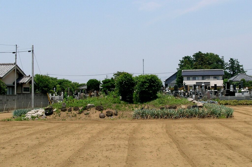 南から。墳丘上には多くの庚申塔がある。表採された埴輪片は比較的新しいもので古墳時代後期の築造と推定されている。なおこの付近は「十二塚」と呼ばれており古墳群があったものと思われる。(資料:新田町史)