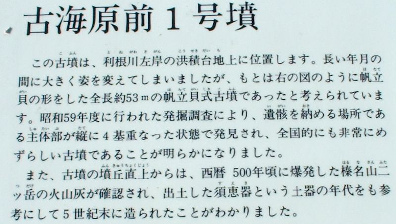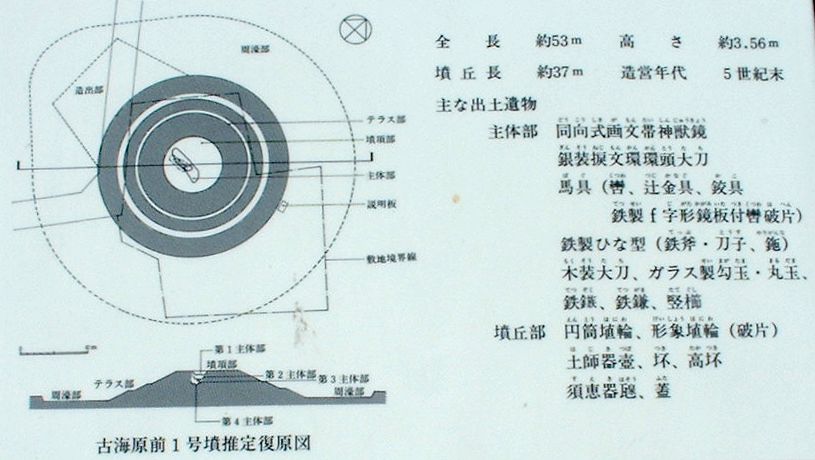 古海原前古墳群1号墳(大川村28号古墳) 帆立貝形墳 全長約53m、墳丘長約37m、高さ約3.56m 古海 台地 鏡、太刀、馬具、鉄製ひな型、円筒・形象埴輪 現地案内板