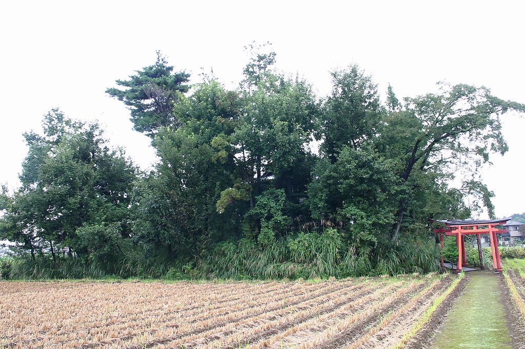 墳丘上には源中稲荷神社社殿。この床下に角閃石安山岩の散乱が見られ、主体部はこの石材を使用した横穴式石室と推定されている。