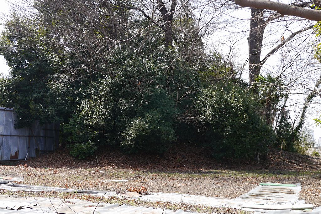 西から。埴輪を有する前方後円墳で6世紀後半の築造と推定されている。ホテルの敷地となっている。(2005年)