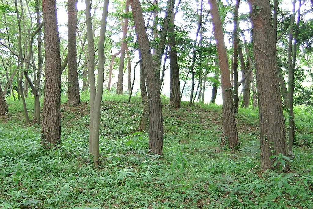 1号墳。大泉町指定史跡である古海原前1号墳の北東にある林の中に多くの古墳が残っている。管理者により下草が刈られ見学しやすい状態。