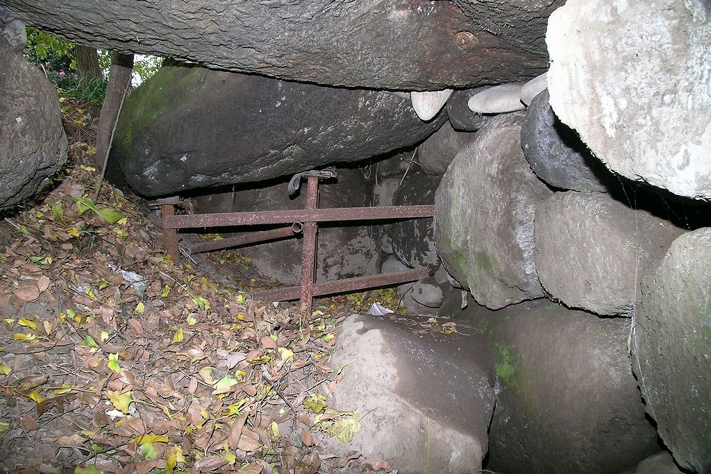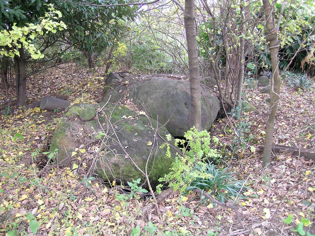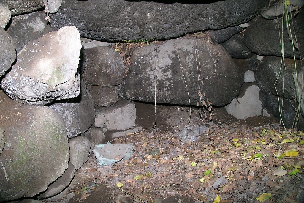 奥壁方向。天井石の一部が落下し崩壊が進んでいる。他の古墳と同じく安山岩の自然石乱石積。