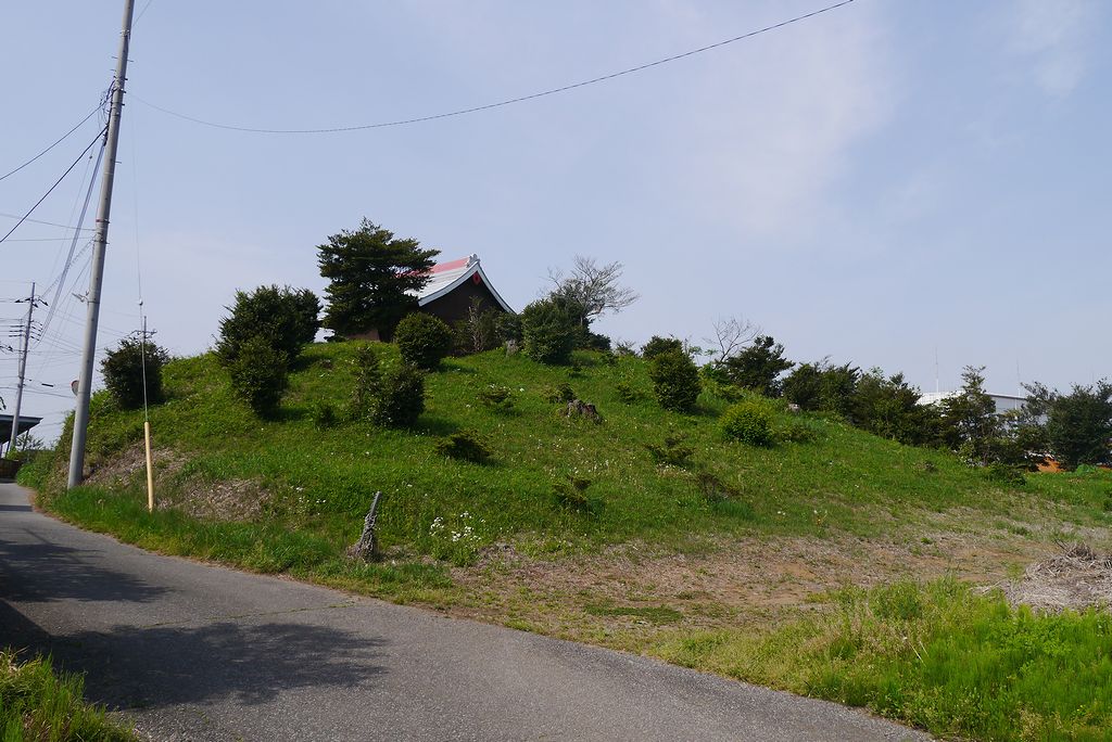 南から。左手前の薮が4号墳。右奥の神社が3号墳。町誌では3,4号合わせて前方後円墳の可能性があるとしている。(群馬県古墳総覧では墳長60mの前方後円墳としている)