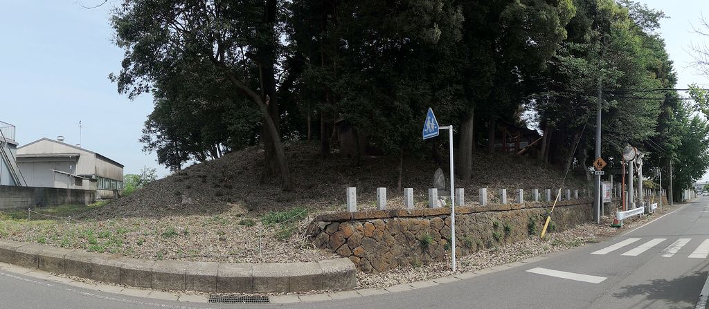 南から。館林市史資料編1によると測量図(平成22年度調査)から後円部見かけの径45m前後(復元系50m前後)、高さ(現状)8.2m、周溝を含めた全長は90m前後と推定している。