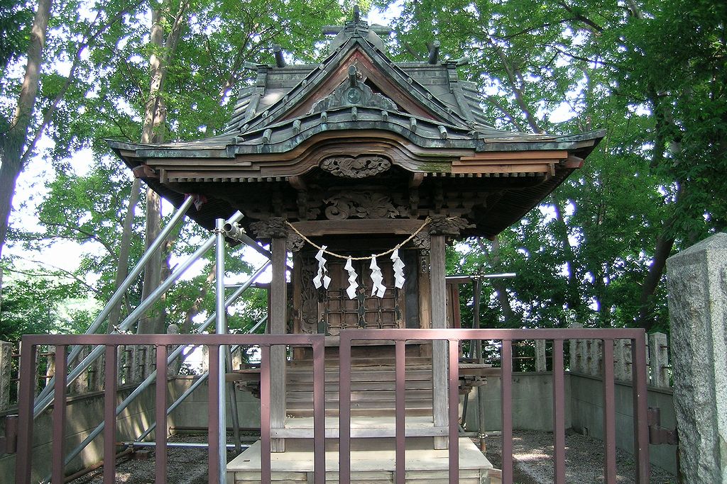 東から。上毛古墳綜覧記載の館林町1号古墳に相当。社殿の奥に墳丘が残る。裾は石垣で方形に整形されている。平成19年度に市史編纂事業で測量調査が行われている。