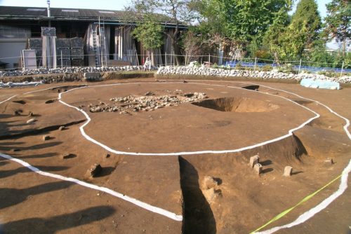 道原遺跡は、渡良瀬川と矢場川に挟まれた微高地上にあります。北関東自動車道の建設に伴い平成16年8月から発掘調査が行われました。縄文土器・方形周溝墓・古墳・室町期の五輪塔・江戸末期の建物・墓・井戸などが検出されています。(写真は平成16年11月21日に行われた現地説明会で撮影)