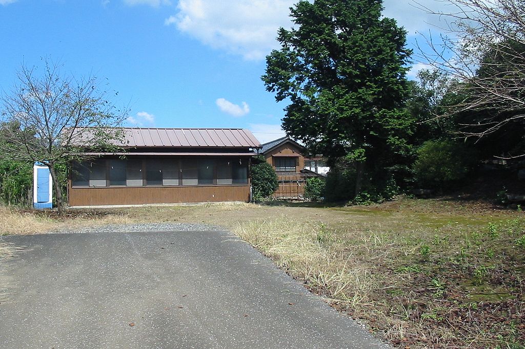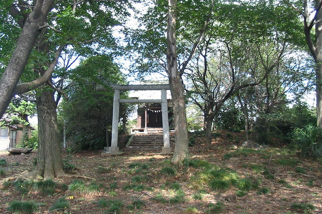 社殿西側の建物の下が前方部、右の木立が後円部。古墳の築造は6世紀後半から7世紀前半と推定されている。