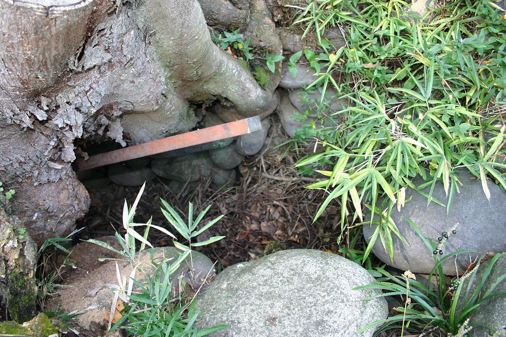 羨道側から玄室。天井石を失った横穴式石室が残っている。河原石を用いた小型の物で玄室長3.2m、幅1m。高さは1.06mと推定される。