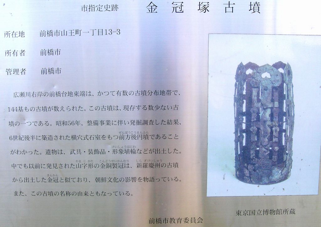 金冠塚古墳(山王二子山古墳、上陽村14号古墳) 前方後円墳 全長53m、後円部直径33m、前方部前幅42m 山王町 須恵器の大甕破片、円筒埴輪、形象埴輪、金銅製冠、大帯、衝角付冑、金銅製大刀、鉄地金銅張の馬具 朝倉・広瀬古墳群