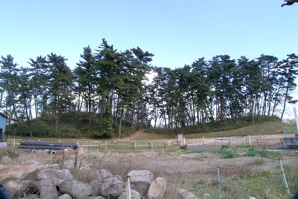 南西から。大型の前方後方墳で国指定史跡。埋葬施設は不明であるが伝承によれば大正時代に村人によって掘られたさい後方部に玉石敷きの部分があったそうである。4世紀初頭の築造と推定されている。
