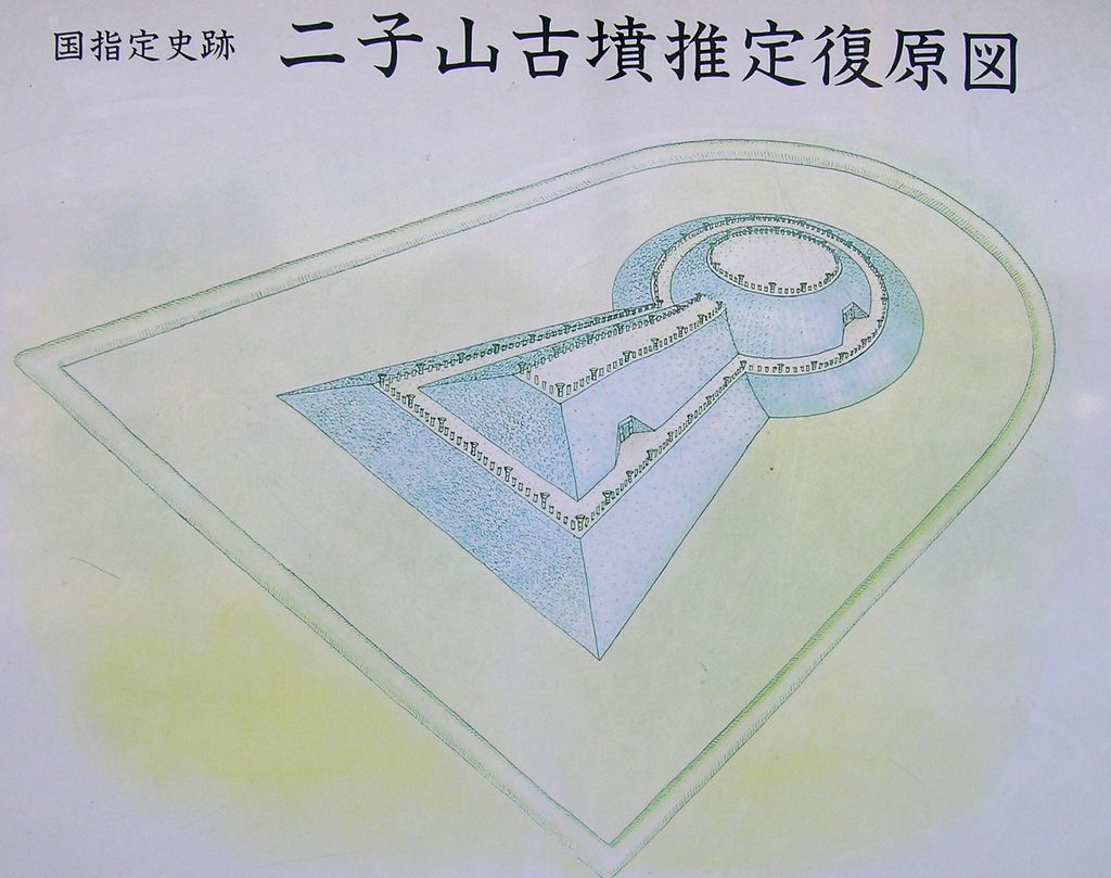 (現地案内板より) 史跡 二子山古墳(総社)2段に築造された前方後円墳である。その規模は現状で全長約90m、前方部前幅61m、後円部径44mであり、前方部が大きく張り出している。 埋葬主体は前方部と後円部に各一つずつ横穴式石室が確認されている。後円部の石室は、榛名山二ツ岳から噴出したと考えられる角閃石安山岩を加工して使用しており、その規模は現状で全長約8.6m、玄室長約7mである。前方部の石室は、自然石を使用したもので、全長8.7m、玄室長4.2m、同幅2.1mであり、両石室ともに規模は大きい。 石室に使用している石材などから前方部の石室がやや古く、6世紀末期に構築されたものと考えられる。