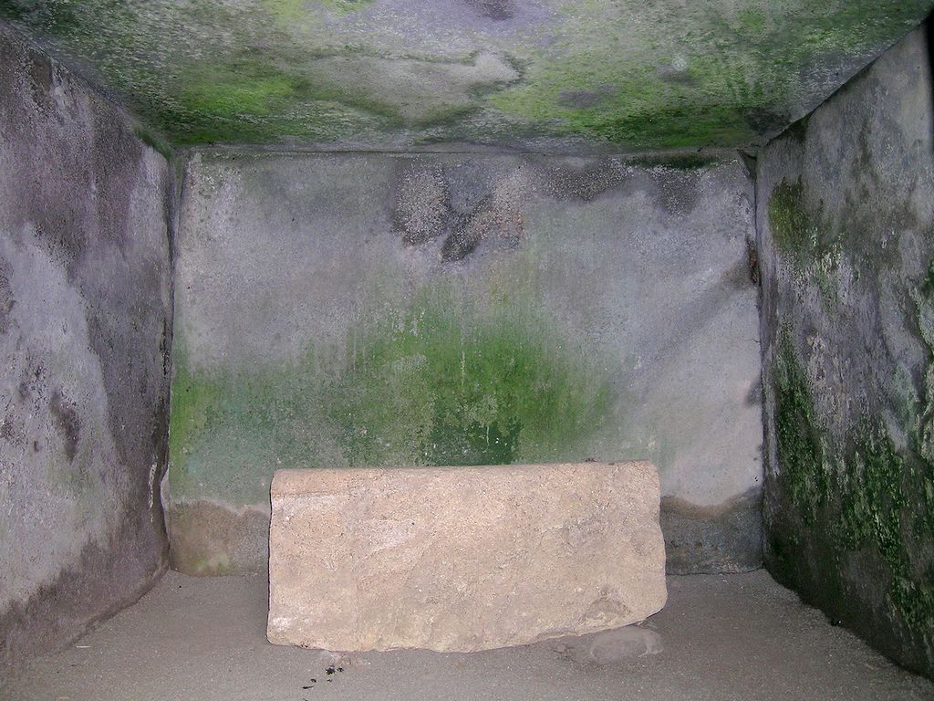 奥壁と天井石。すべて輝石安山岩の一枚の巨石を使用。壁面に漆喰が塗られている。