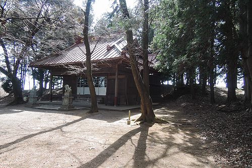 丘陵の頂部を整形し北向きに建てられた諏訪神社社殿。古墳も頂部にあるはずだが判然としない。