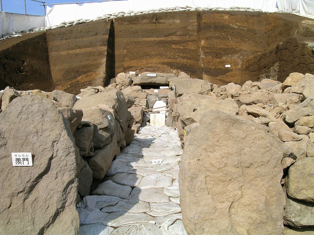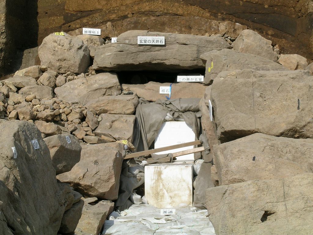 羨道部分にあった天井石は一時撤去。敷石の上面にはベンガラによる赤彩が鮮明に残されていたそうである。墳丘の断面から構築の様子がわかる。