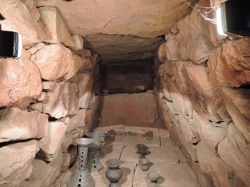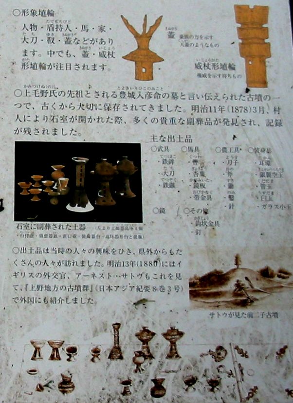 玄室長5.2m、幅1.7m、高さ1.8メートル。前二子古墳復元プロジェクトの一環で2007/05に設置された須恵器・土師器。アーネスト・サトウのスケッチで有名なトリ・カメ・ヘビ・カエルの小像のある装飾付須恵器もあった。
