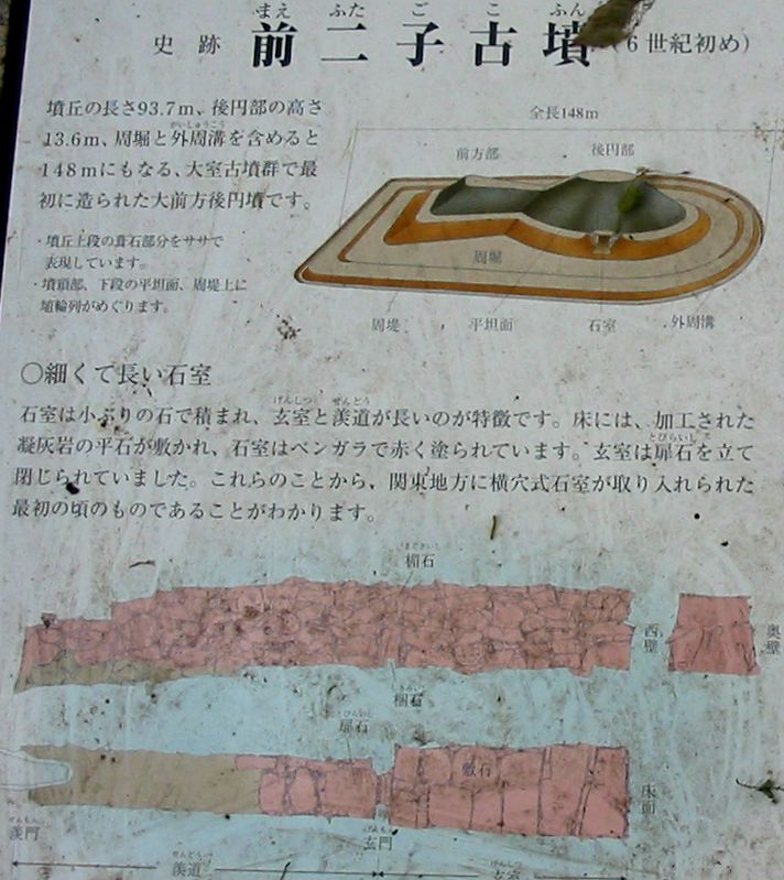 前二子古墳(荒砥村51号古墳) 前方後円墳 主軸長94m、後円部径69m、前方部前幅65m、高14m、 西大室町 丘陵、山林 鏡、金銅製馬具、鉄鉾、須恵器、土師器、円筒埴輪、形象埴輪、横穴式石室 現地案内板、群馬県古墳総覧